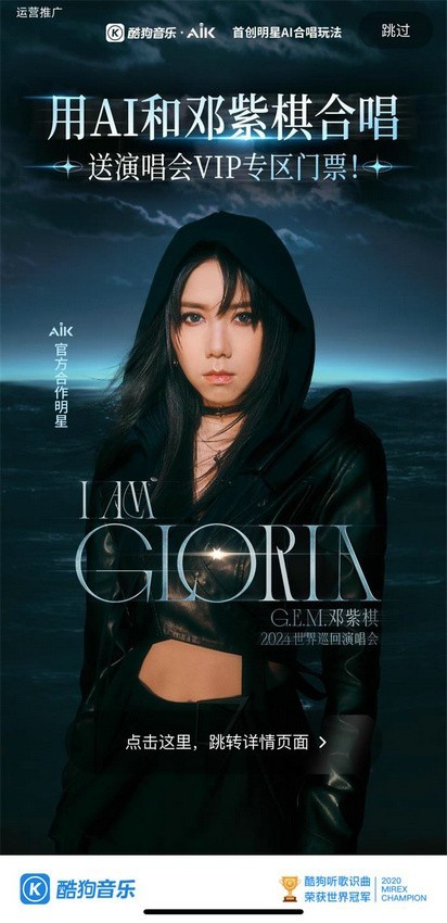 这是邓紫棋取酷狗音乐AIK合做上线的AI翻唱+AI合唱勾当。